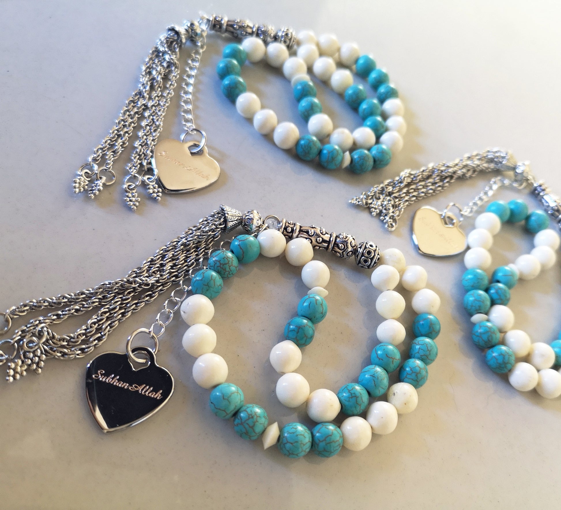 33 beads camel bone and feroza tasbih with an engraved heart 'SubhanAllah'