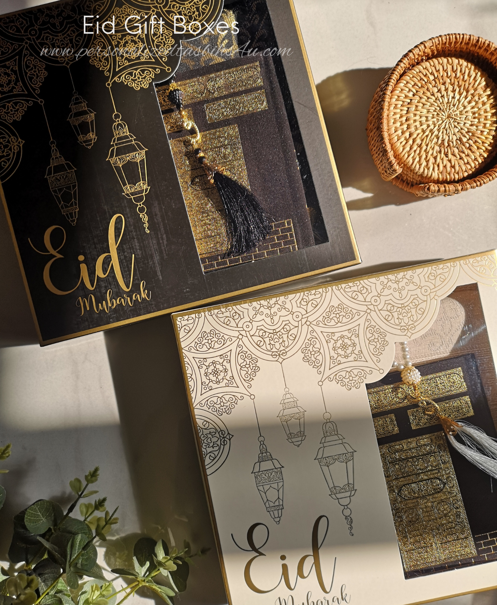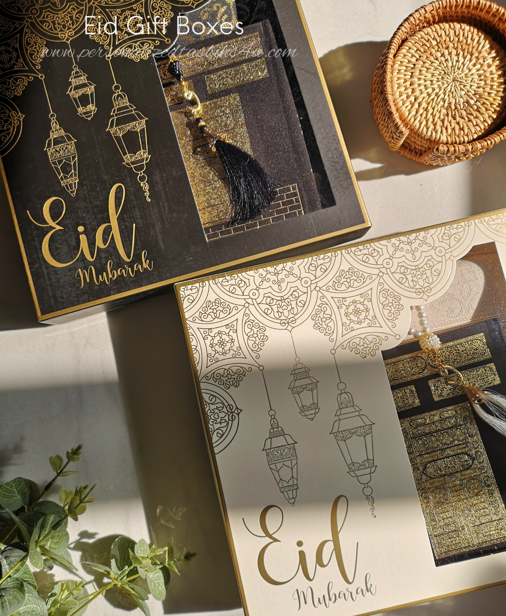 Beautifully decorated Eid Mubarak box with prayer mat, tasbih and Surah Book (Surahs: Yasin, Baqarah and Kahf) - please note this is not a full Quran.