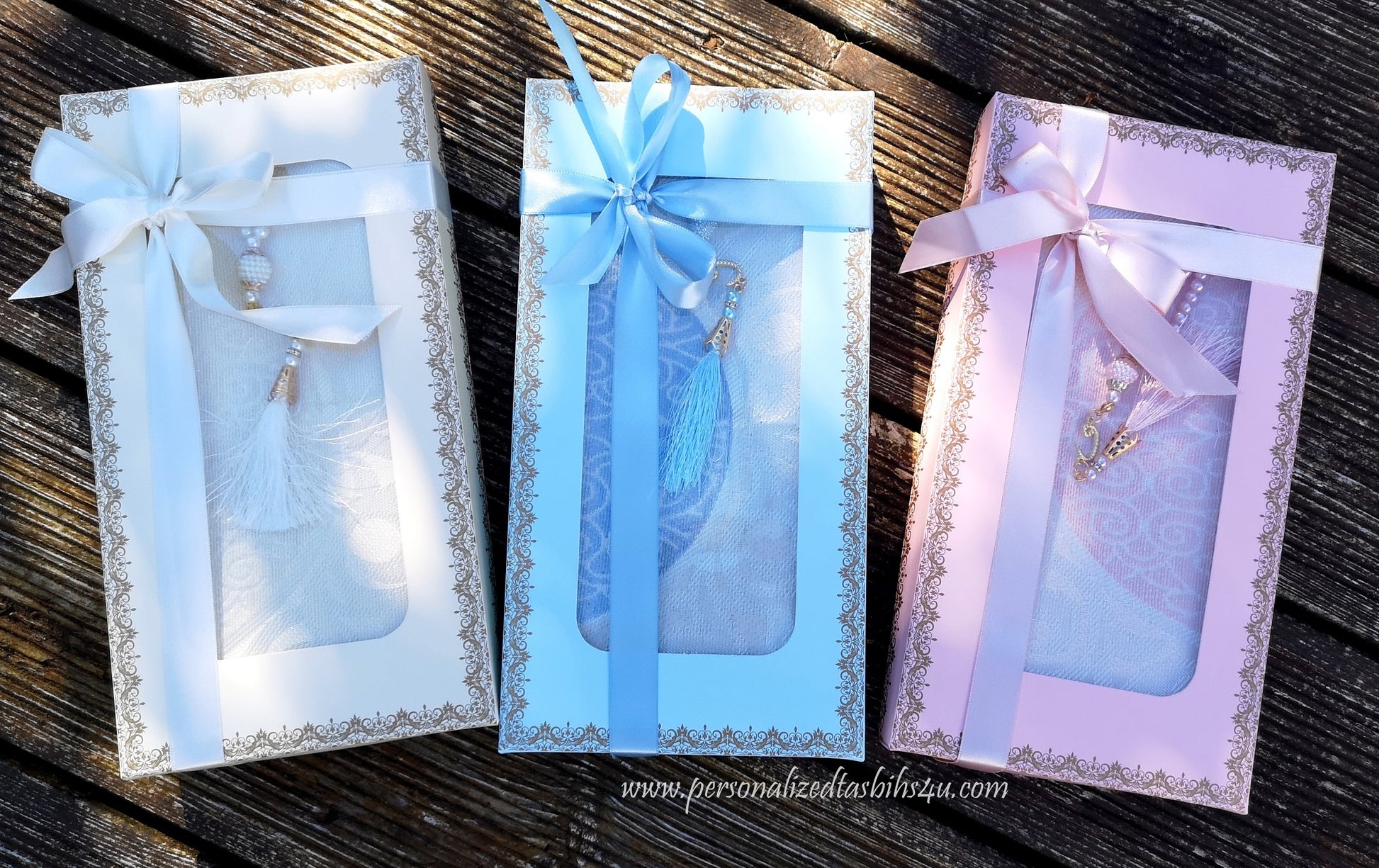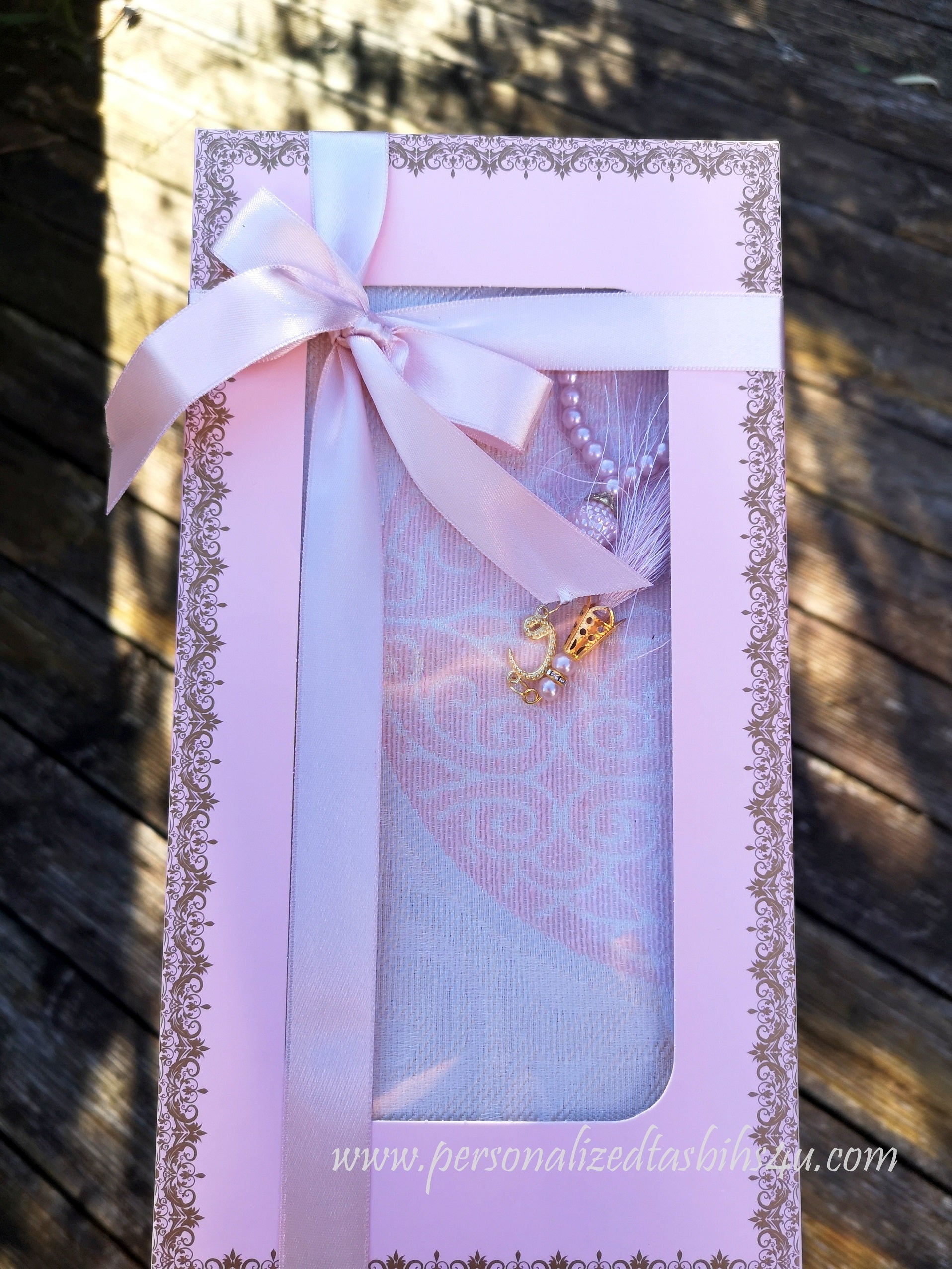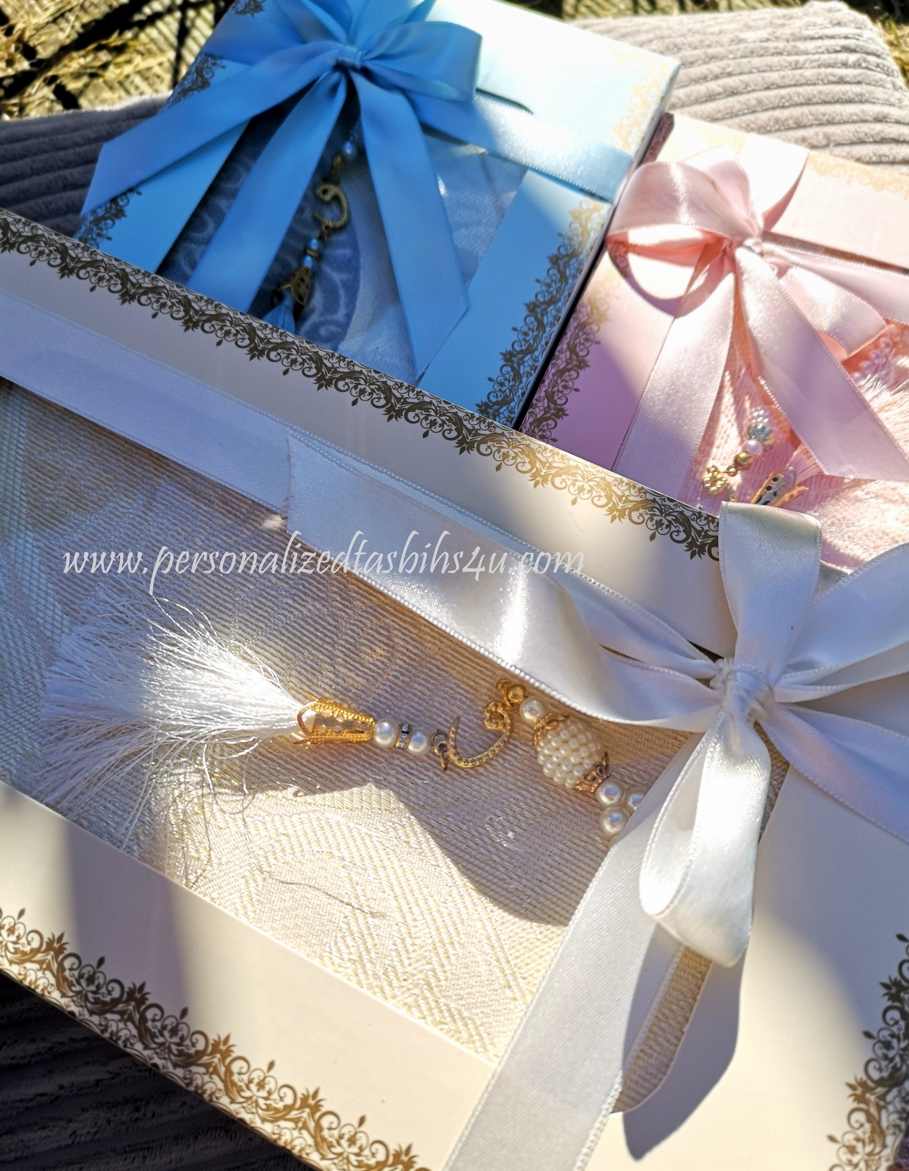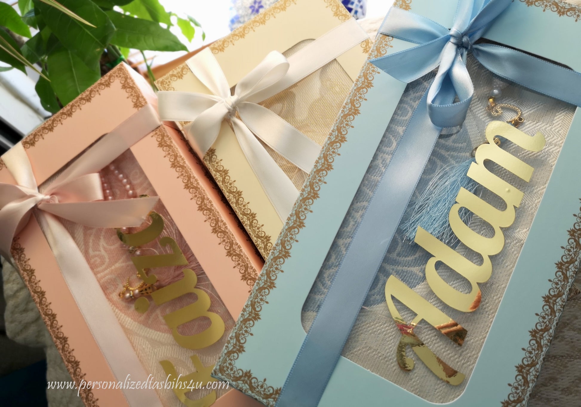 Can be personalised (for FREE) with one name in gold on the gift box itself, can be Arabic or English. The tasbih itself cannot be personalised.