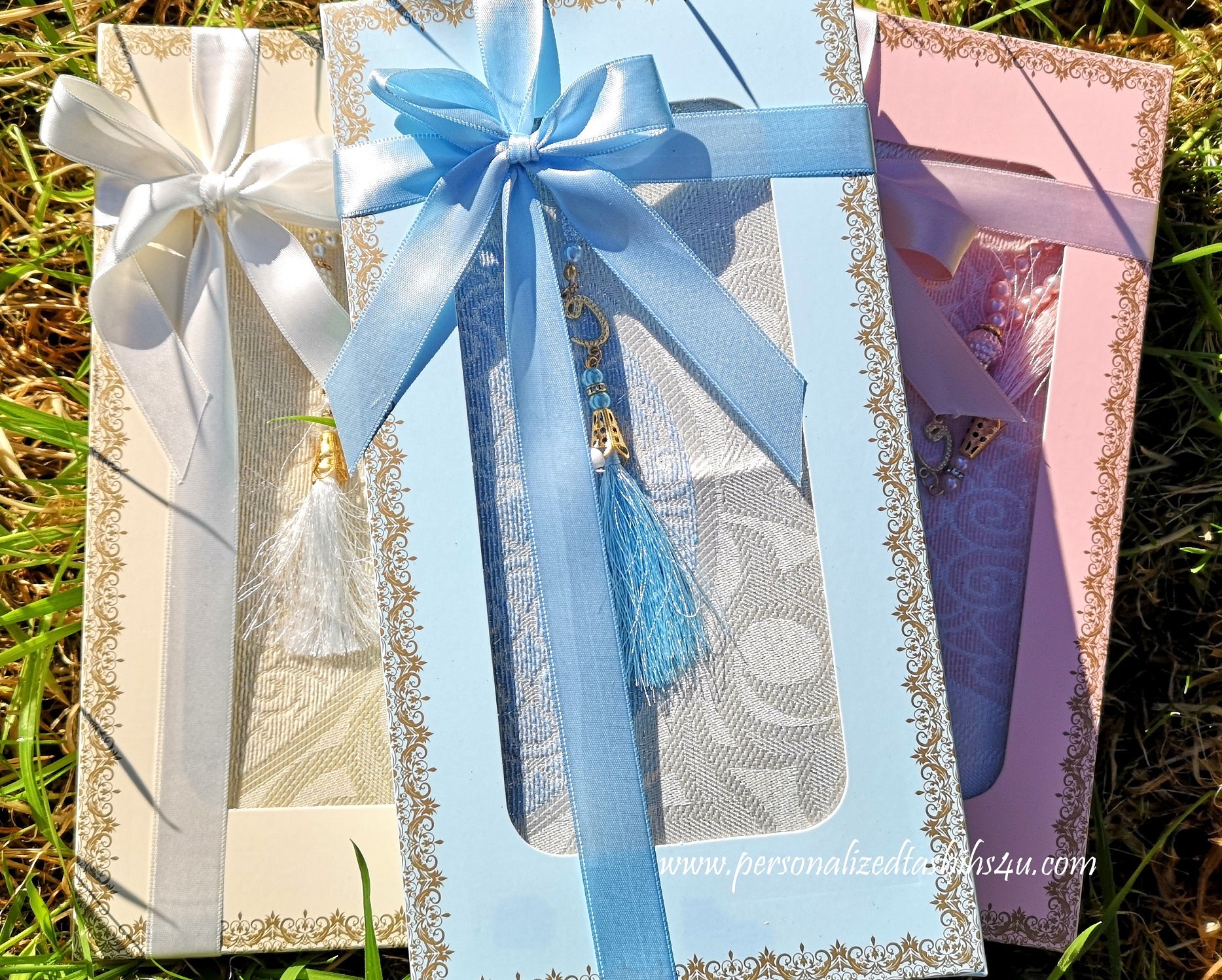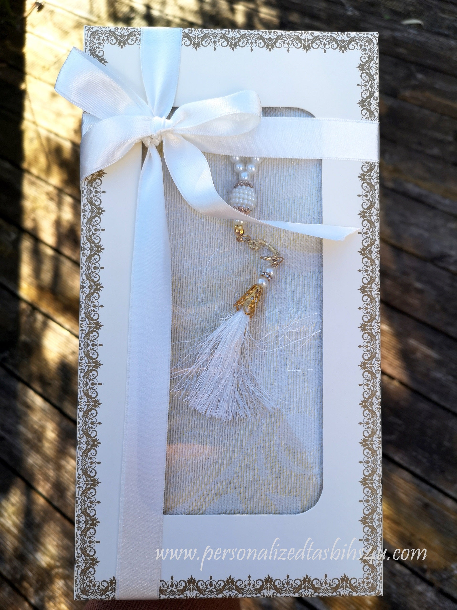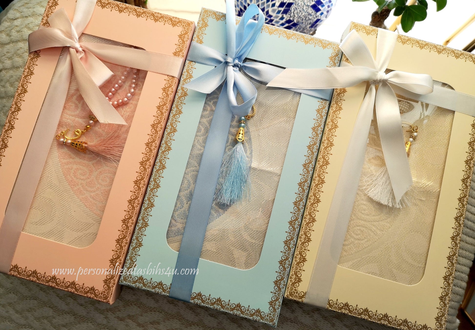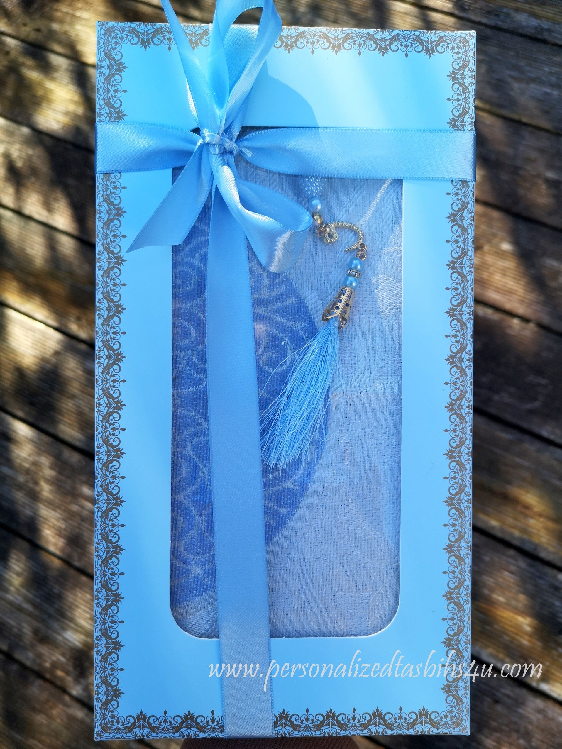 Can be personalised (for FREE) with one name in gold on the gift box itself, can be Arabic or English. The tasbih itself cannot be personalised.