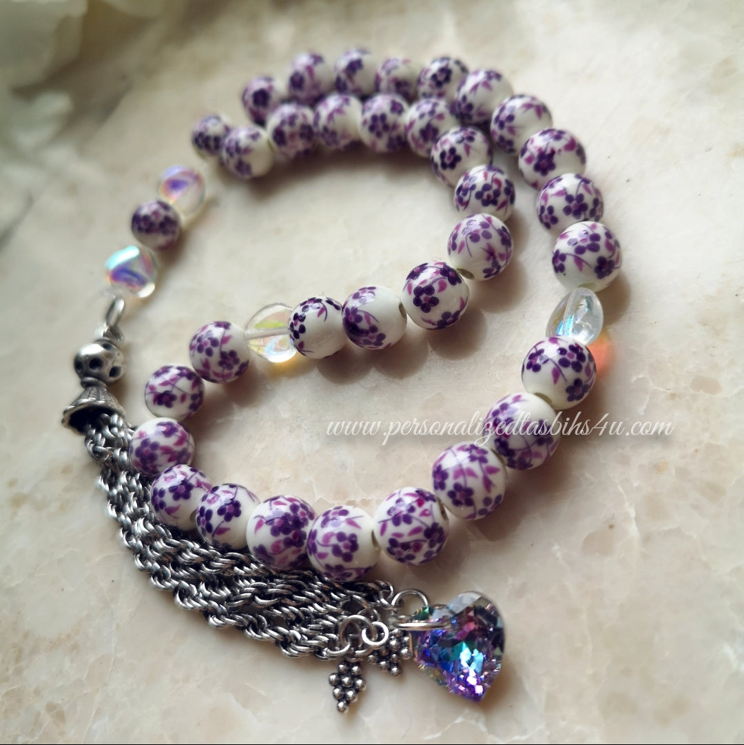 Delicate porcelain beads with a Purple Crystal Heart from Swarovski are attached to the tassel.