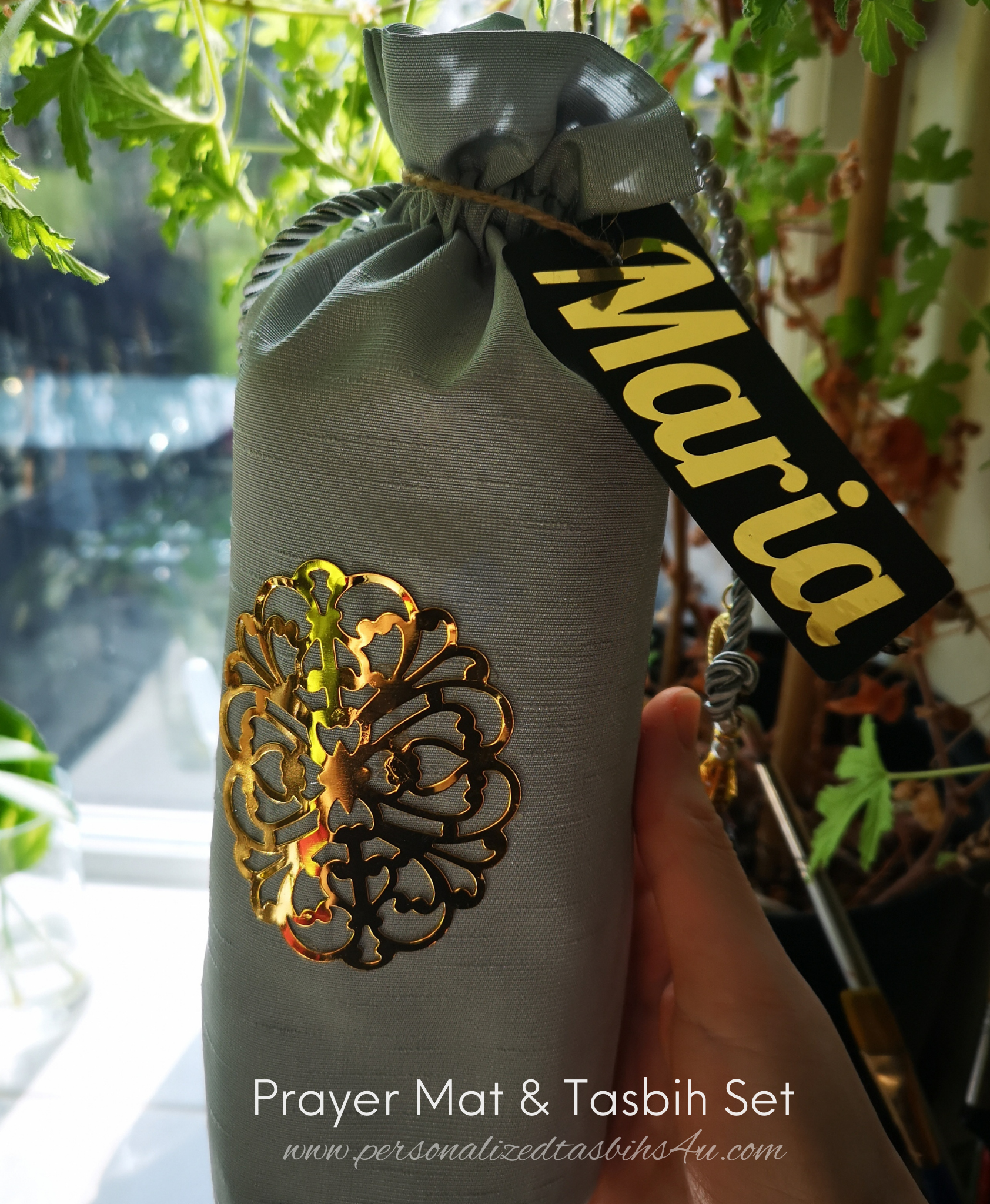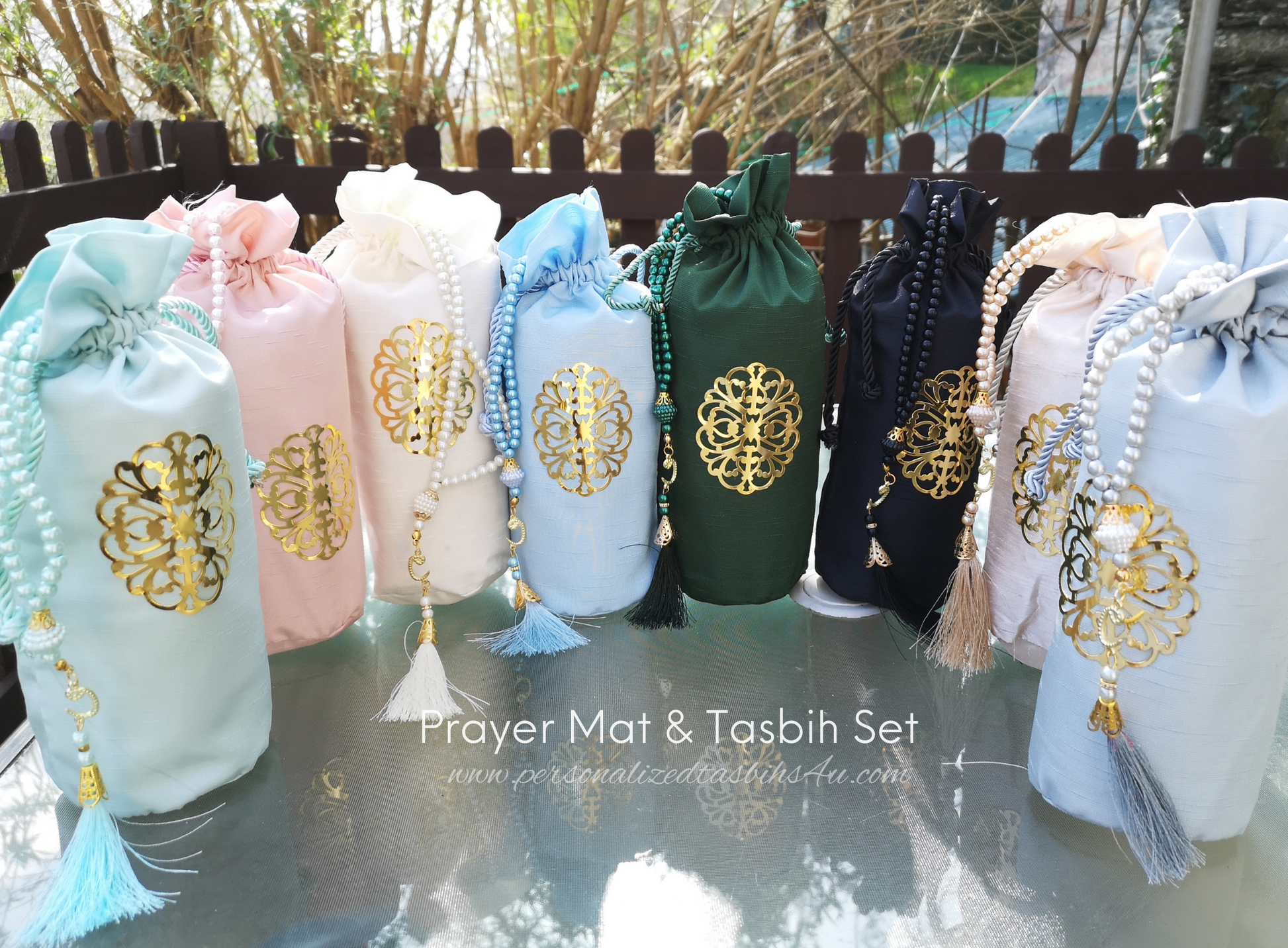 Our Prayer Mat & Tasbih Set - comes with a free gift tag that is attached with one name of your choice in English or Arabic. 8 colours available - limited quantity.